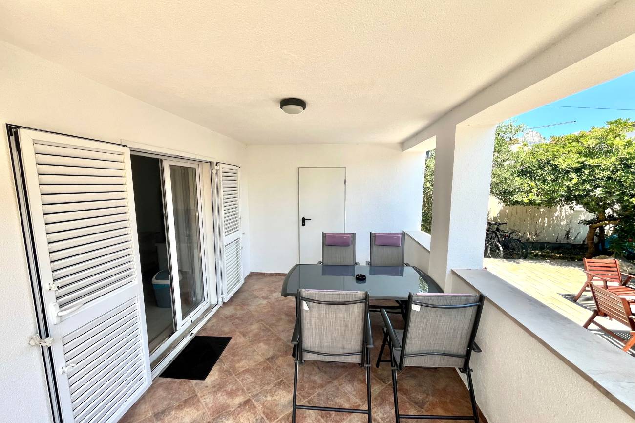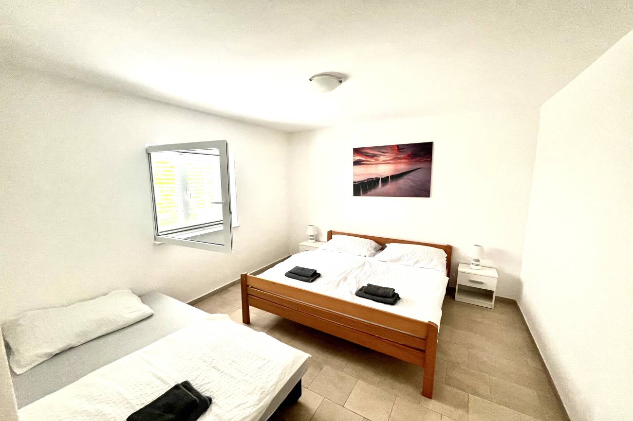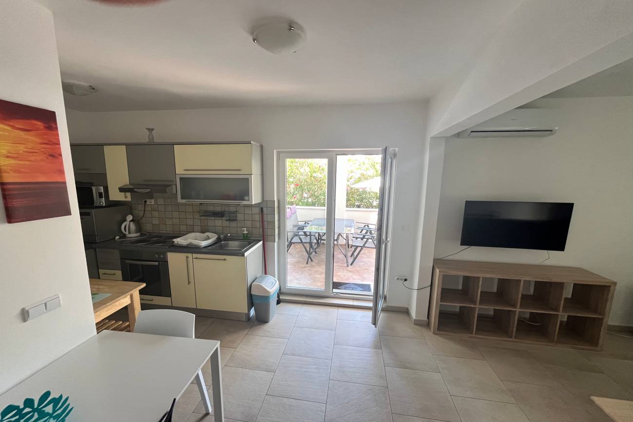 Apartmán, 3+kk 55m2 + 20m2 terasa pro 6 osob (4+2) v přízemí vily s klimatizací, satelitní televizí obsahuje obývací pokoj s kuchyní, ložnice, koupelna s toaletou, venkovní terasa, dětská postýlka. Apartmán je vhodný pro ubytování 6 osob(4+2). Plastová okna jsou opatřena síťkami proti hmyzu.