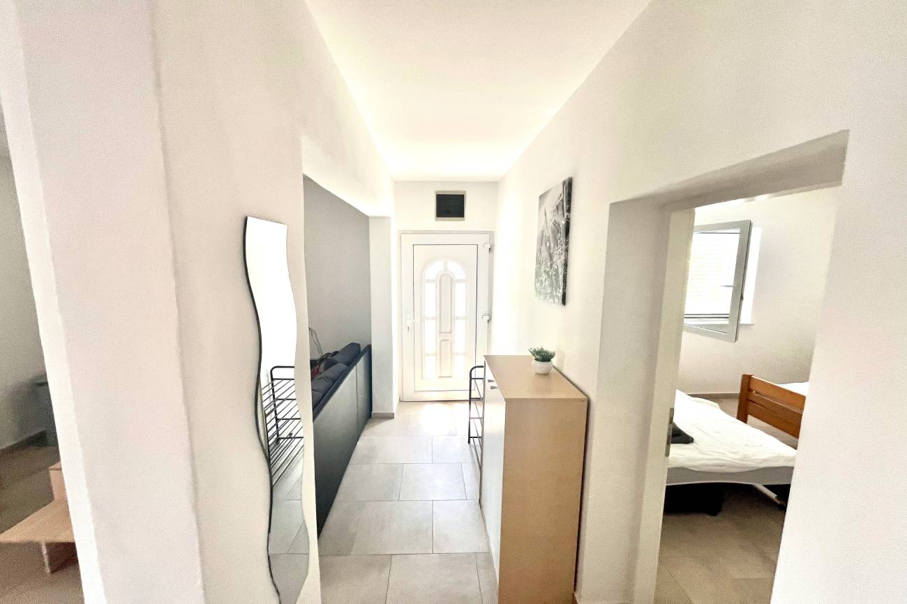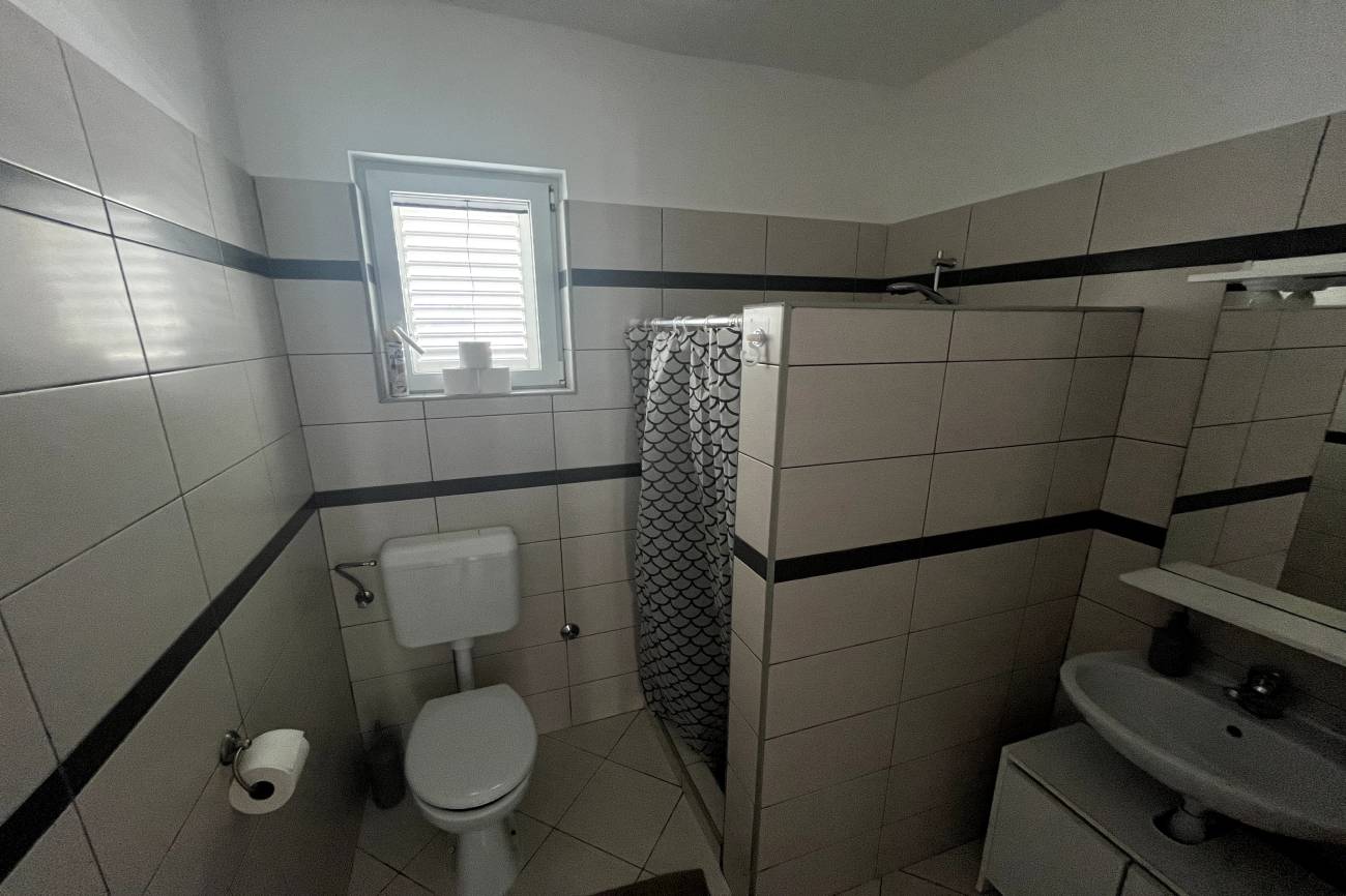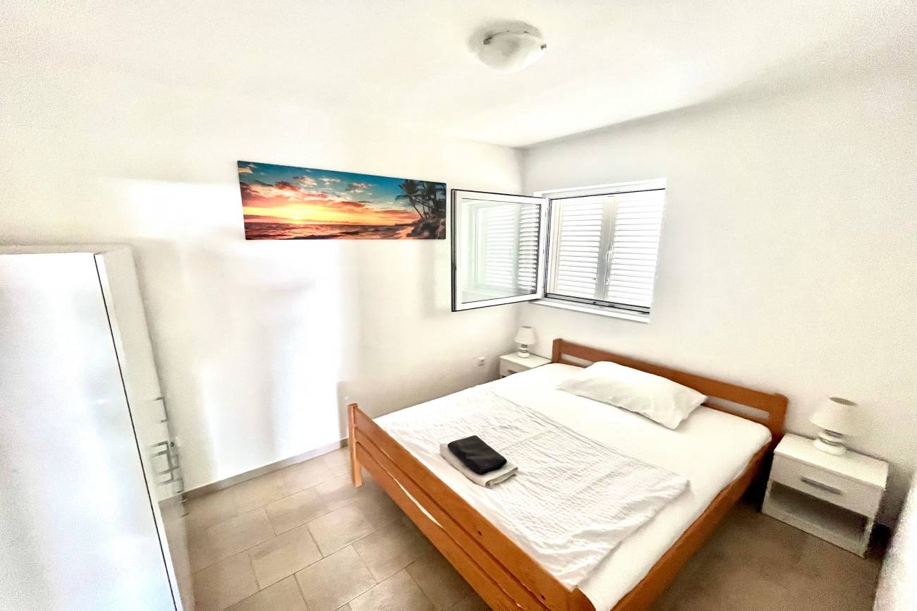 Apartmán, 3+kk 55m2 + 20m2 terasa pro 6 osob (4+2) v přízemí vily s klimatizací, satelitní televizí obsahuje obývací pokoj s kuchyní, ložnice, koupelna s toaletou, venkovní terasa, dětská postýlka. Apartmán je vhodný pro ubytování 6 osob(4+2). Plastová okna jsou opatřena síťkami proti hmyzu.